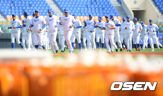 대표팀 선수들이 외야에서 몸을 풀고 더그아웃으로 향하고 있다.