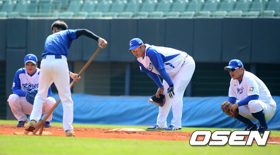 이승엽, 이대호, 김태균이 수비 훈련을 하며 그라운드 정비하는 사이 휴식을 취하고 있다.