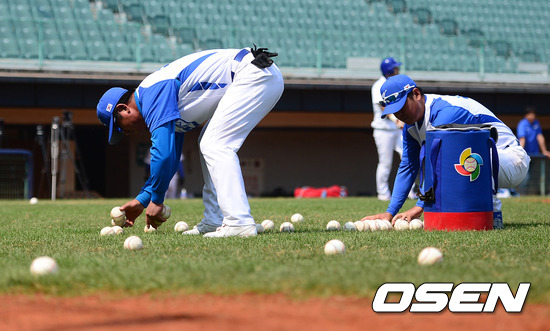 류중일 감독이 볼을 주으며 훈련을 돕고 있다.