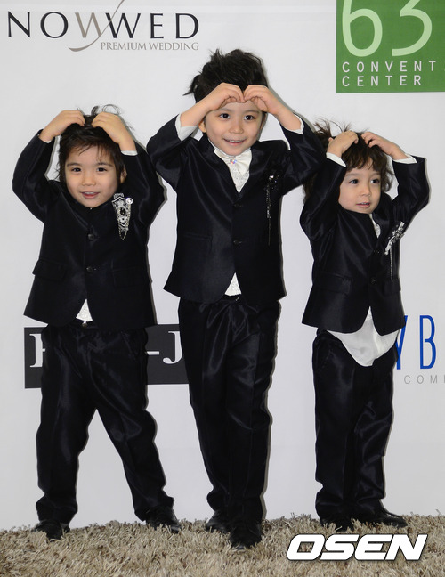22일 오후 서울 여의도 63시티에서 열리는 윤형빈·정경미 결혼식에 참석한 문메이빈, 문메이슨, 문에이든이 포토타임을 갖고 있다.
