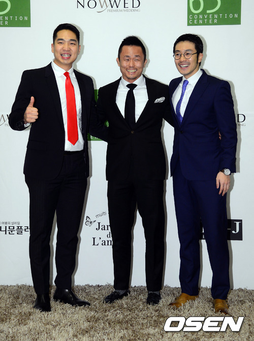 22일 오후 서울 여의도 63시티에서 열리는 윤형빈·정경미 결혼식에 하객으로 참석한 후니훈, 서두원, 이켠이 포토타임을 갖고 있다.