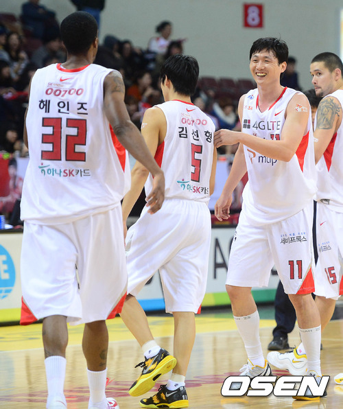 22일 오후 안양 실내체육관에서 열린 'KB 국민카드 2012-2013 프로농구' 안양 KGC인삼공사와 서울 SK의 경기 2쿼터 종료 후 김동우가 헤인즈를 바라보며 미소를 짓고 있다.