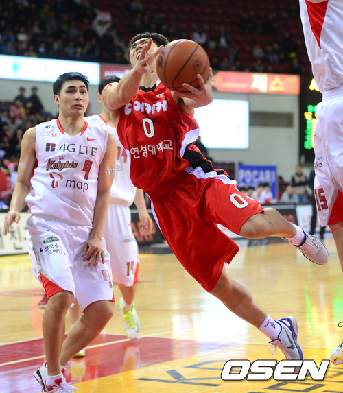 22일 오후 안양 실내체육관에서 열린 'KB 국민카드 2012-2013 프로농구' 안양 KGC인삼공사와 서울 SK의 경기 3쿼터 김윤태가 넘어지면서 슛을 시도하고 있다.
