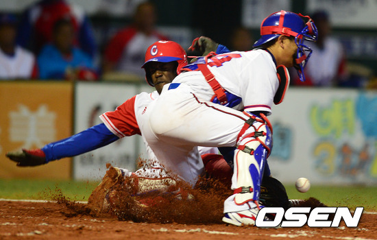 2회초 쿠바 기에르모 에레디아가 적시타에 대만 가오즈강의 태그에 앞서 홈에서 세이프되고 있다.
