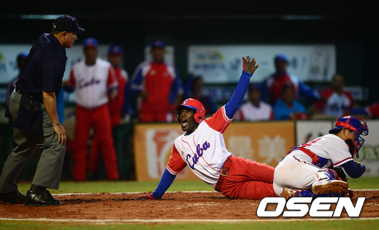 2회초 쿠바 기에르모 에레디아가 적시타에 대만 가오즈강의 태그에 앞서 홈에서 세이프되고 있다.