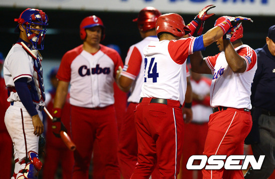 2회초 쿠바 알프레도 데스파이녜가 스리런 홈런을 날리고 동료선수들과 하이파이브를 하고 있다. 쿠바는 2회에만 10득점했다.