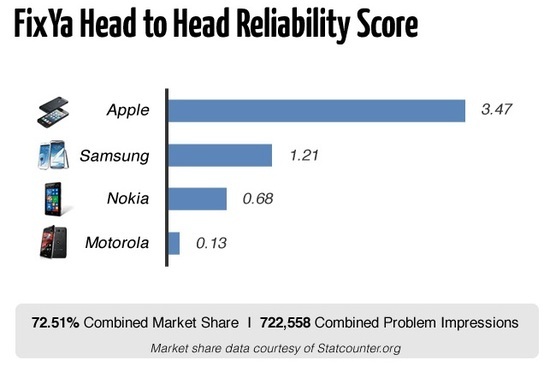 조사를 실시한 곳은 미국 전자제품 서비스 전문업체 픽스야(FixYa)로, 자사 홈페이지에 게시된 72만 2558개의 소비자 불만글과 정보통신환경 분석 업체 스탯카운터(StatCounter)의 제조사별 시장 점유율을 합해 연구 결과를 도출했다.