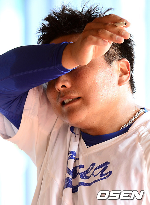 경기에 앞서 김태균이 훈련을 마치고 더그아웃에서 땀을 닦고 있다.