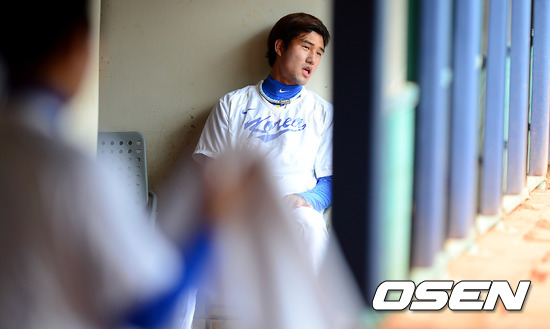 경기에 앞서 김상수가 훈련을 마치고 더그아웃에서 휴식을 취하고 있다.