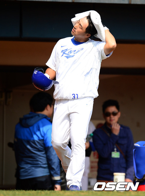 경기에 앞서 손아섭이 훈련을 하며 땀을 닦고 있다.