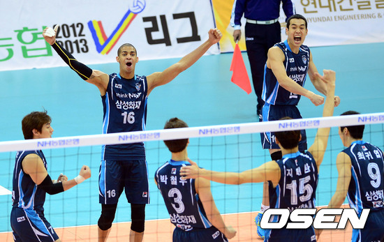 23일 오후 수원 실내체육관에서 열린 '2012-2013 NH농협 V-리그' 남자부 KEPCO와 삼성화재의 경기 1세트 삼성화재 선수들이 득점 후 기뻐하고 있다.