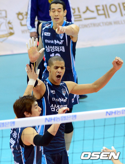 23일 오후 수원 실내체육관에서 열린 '2012-2013 NH농협 V-리그' 남자부 KEPCO와 삼성화재의 경기 1세트 삼성화재 선수들이 득점 후 기뻐하고 있다.