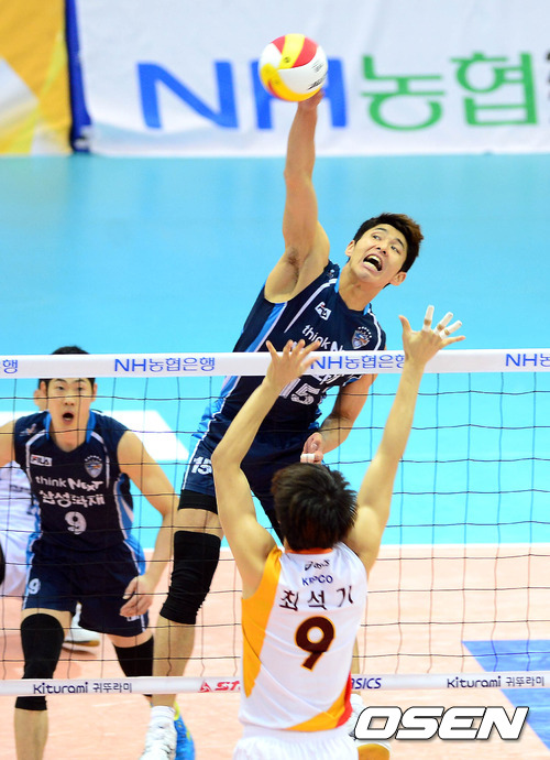 23일 오후 수원 실내체육관에서 열린 '2012-2013 NH농협 V-리그' 남자부 KEPCO와 삼성화재의 경기 1세트 지태환이 공격을 시도하고 있다.