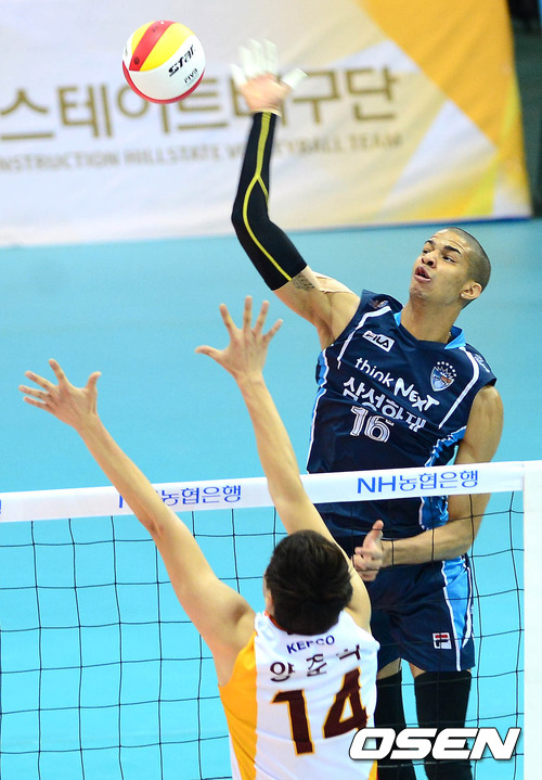 23일 오후 수원 실내체육관에서 열린 '2012-2013 NH농협 V-리그' 남자부 KEPCO와 삼성화재의 경기 1세트 레오가 공격을 시도하고 있다.