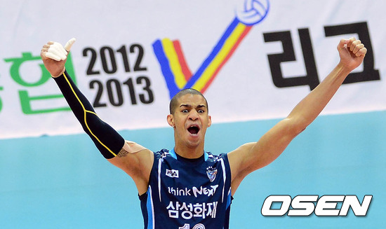 23일 오후 수원 실내체육관에서 열린 '2012-2013 NH농협 V-리그' 남자부 KEPCO와 삼성화재의 경기 1세트 레오가 득점 후 환호하고 있다.