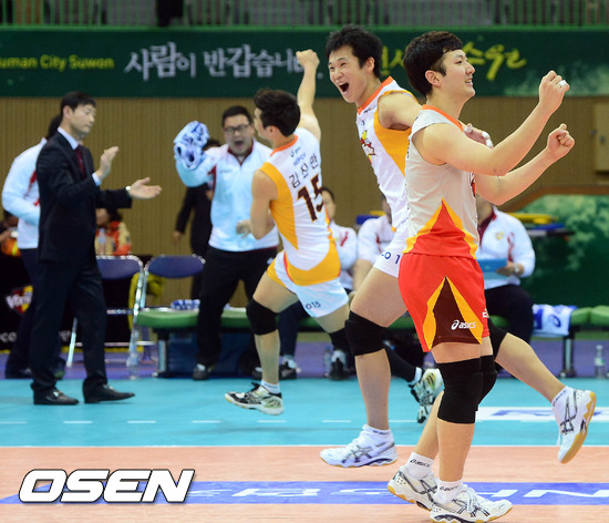 23일 오후 수원 실내체육관에서 열린 '2012-2013 NH농협 V-리그' 남자부 KEPCO와 삼성화재의 경기 2세트 승리를 한 KEPCO 선수들이 환호하고 있다.