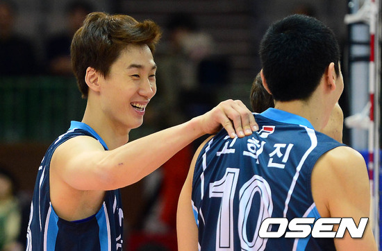 23일 오후 수원 실내체육관에서 열린 '2012-2013 NH농협 V-리그' 남자부 KEPCO와 삼성화재의 경기 3세트 박철우가 고희진의 어깨를 주물러주고 있다.