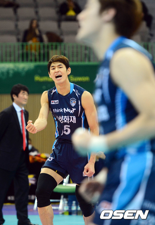 23일 오후 수원 실내체육관에서 열린 '2012-2013 NH농협 V-리그' 남자부 KEPCO와 삼성화재의 경기 3세트 지태환이 환호하고 있다.