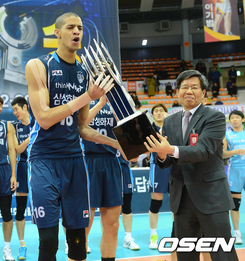 23일 오후 수원 실내체육관에서 열린 '2012-2013 NH농협 V-리그' 남자부 KEPCO와 삼성화재의 경기 종료 후 레오가 정규리그 우승 트로피를 받고 있다.