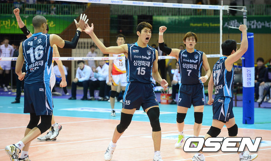 23일 오후 수원 실내체육관에서 열린 '2012-2013 NH농협 V-리그' 남자부 KEPCO와 삼성화재의 경기 4세트 삼성화재 선수들이 득점 후 환호하고 있다.