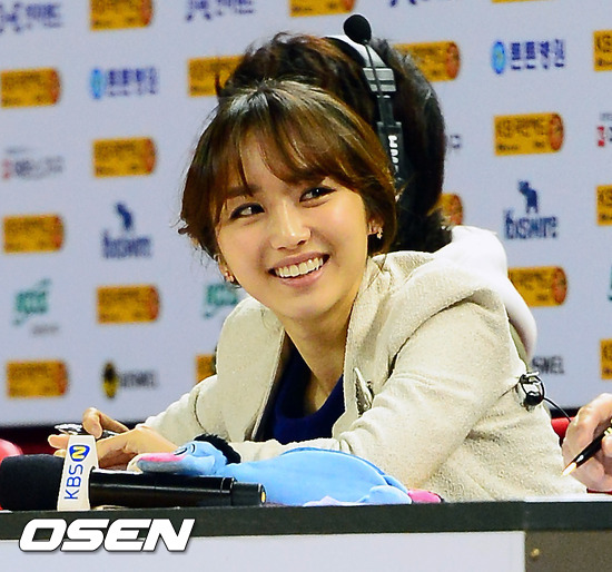4쿼터 KBSN 윤태진 아나운서가 환하게 웃으며 경기를 지켜보고 있다. / rumi@osen.co.kr