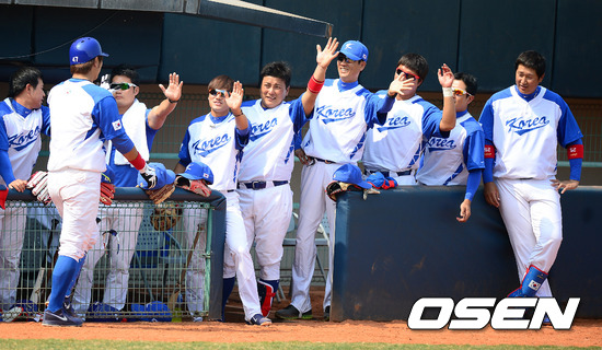 3회말 1사에서 대표팀 강민호가 솔로포를 날리고 더그아웃에서 동료선수들과 하이파이브를 하고 있다./jpnews@osen.co.kr