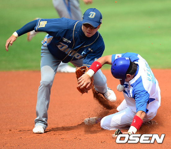 1회말 1사 1루에서 대표팀 이용규가 NC 차화준의 태그에 앞서 2루 도루에 성공하고 있다. 이용규는 송구된 볼에 맞았지만 문제없이 경기를 소화했다. /jpnews@osen.co.kr