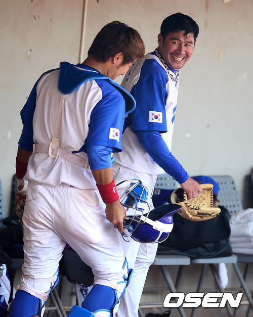 대표팀 선발 서재응이 3이닝 무실점 호투하고 더그아웃에서 강민호와 이야기를 나누고 있다./jpnews@osen.co.kr