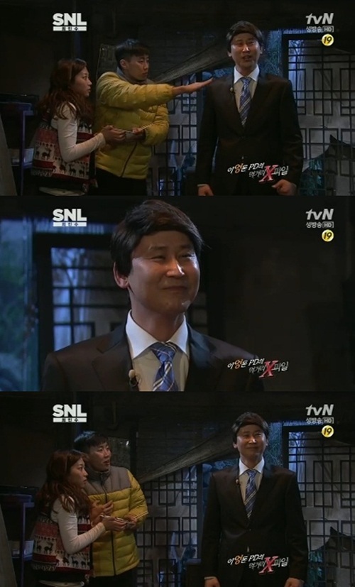 신동엽은 23일 생방송된 tvN 코미디 프로그램 'SNL코리아'에서 박재범, 김슬기와 '이엉돈 PD의 먹거리 X파일'을 연기하던 중 "이엉돈 아냐?"라는 박재범의 애드리브에 웃음을 터트렸다.