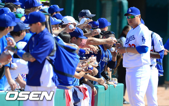 [OSEN=글렌데일(미국 애리조나), 곽영래 기자] 24일(한국시간) 미국 애리조나 글렌데일 캐멀백 랜치 스타디움에서 열린 2013 메이저리그 LA 다저스와 시카고 화이트삭스의 시범경기, 경기에 앞서 경기장에 들어서는 류현진이 팬들에게 사인을 하고 있다.