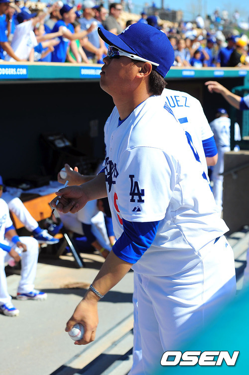 24일(한국시간) 미국 애리조나 글렌데일 캐멀백 랜치 스타디움에서 열린 2013 메이저리그 LA 다저스와 시카고 화이트삭스의 시범경기, 경기에 앞서 류현진이 더그아웃 위 팬들에게 사인볼을 던져주고 있다