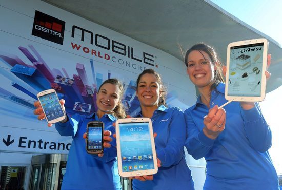 삼성전자 모델들이 스페인 바르셀로나에서 열리는 'MWC 2013' 개막 하루전인 24일(현지시간), 성가족 성당(Sagrada Familia)에서 보급형 LTE폰 '갤럭시 익스프레스', 아웃도어 특화 스마트폰 '갤럭시 엑스커버2', 8인치 화면에 S펜이 탑재된 '갤럭시 노트 8.0' 등을 선보이고 있다.