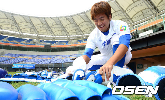강민호가 보호장비를 닦으며 훈련 준비를 하고 있다.