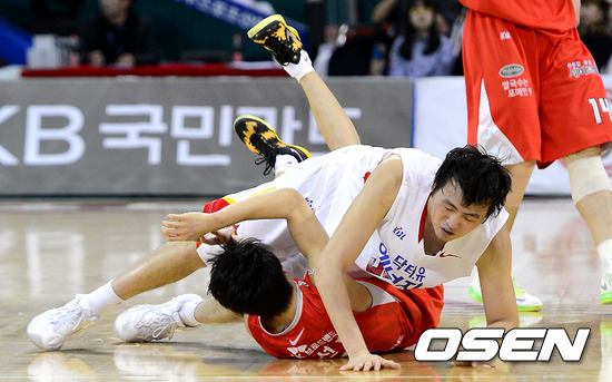24일 오후 서울 잠실학생체육관에서 열린 'KB 국민카드 2012-2013 프로농구' 서울 SK와 고양 오리온스의 경기, 2쿼터 SK 김선형과 오리온스 김승원이 넘어지고 있다.