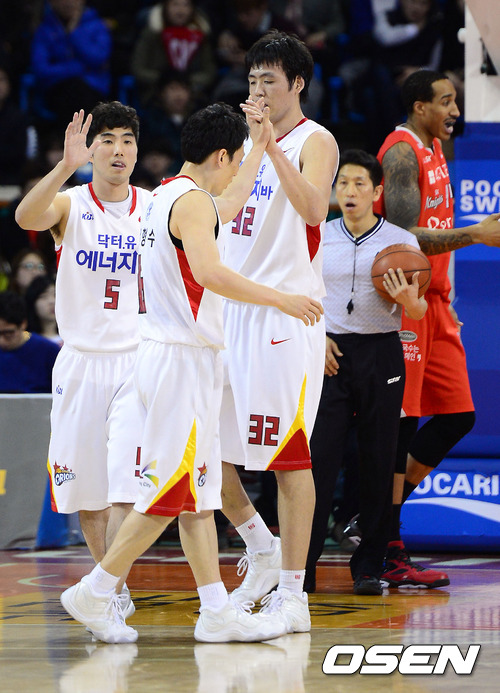 24일 오후 서울 잠실학생체육관에서 열린 'KB 국민카드 2012-2013 프로농구' 서울 SK와 고양 오리온스의 경기, 2쿼터 오리온스 김승원이 바스켓 카운트를 얻어낸 뒤 동료들과 하이파이브를 하고 있다.