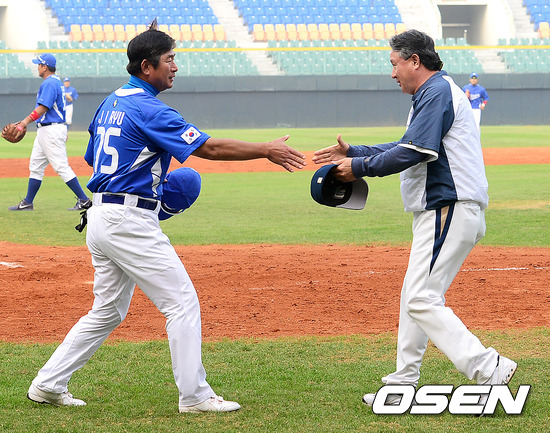 경기후 대표팀 류중일 감독과 NC 김경문 감독이 악수를 나누고 있다./jpnews@osen.co.kr