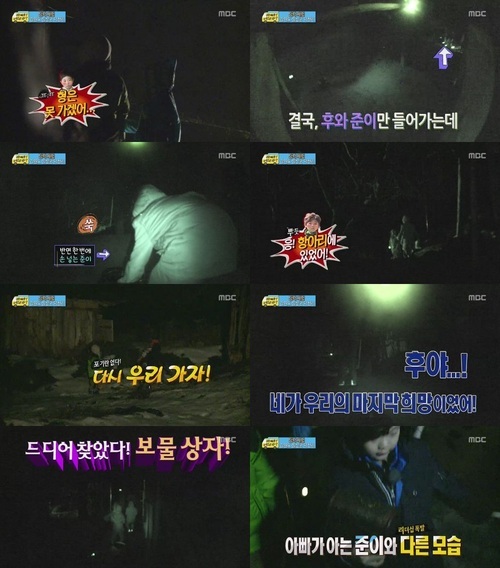 외딴집에 들어간 윤후와 성준은 항아리를 찾았다. 성준은 거리낌 없이 항아리에 손을 넣어 지령이 있는 종이를 찾고 다시 나왔다. 성준은 후에게 "다시 가자 후야 우린 하나잖아"라고 말하자 준수까지 나서 힘을 보탰다. 민국은 여전히 밖에서 기다리며 볼을 꼬집어 "이렇게 생생한거 보니 꿈은 아닌데"라고 말해 웃음을 자아냈다.