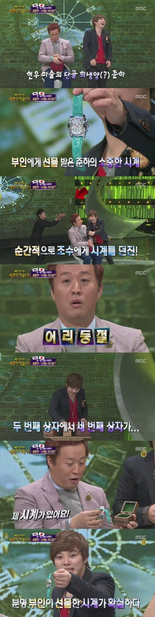 최현우가 MC 정준하의 시계를 사용해 타임머신 마술을 선보였다. 정준하는 차고 있던 시계를 풀며 "이렇게 가져간 시계가 한 두 개가 아니다"라고 폭로하며 최현우를 당황케 했다.