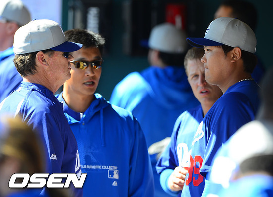 3회말 공수교대때 첫 등판서 무실점 기록한 류현진이 더그아웃에서 허니컷 투수 코치와 이야기를 나누고 있다./soul1014@osen.co.kr