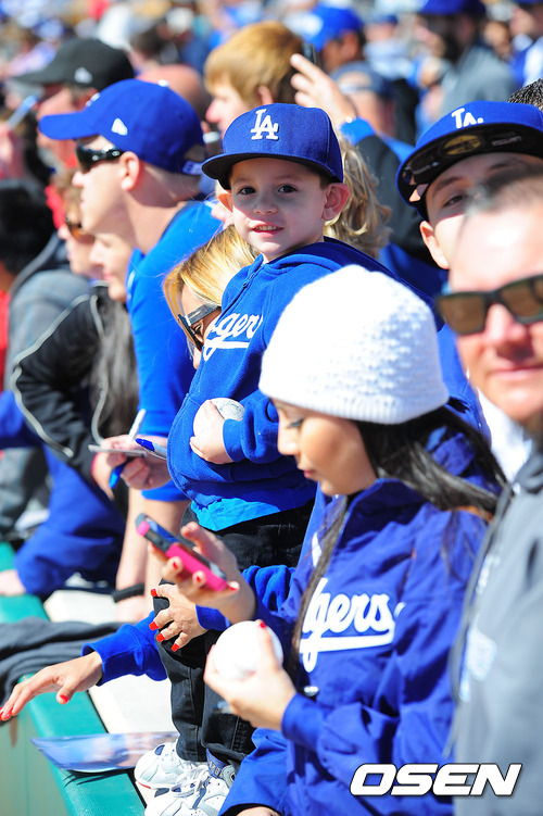 경기에 앞서 다저스 꼬마팬이 사인을 위해 외야펜스에서 선수들을 기다리고 있다. /soul1014@osen.co.kr