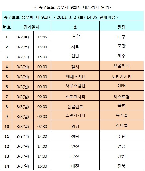 [축구토토] 국민체육진흥공단(www.kspo.or.kr)이 발행하는 체육진흥투표권 수탁사업자인 스포츠토토(www.sportstoto.co.kr)는 내달 2일부터 2일간 벌어지는 국내 프로축구(K리그 클래식) 7경기 및 잉글랜드 프리미어리그(EPL) 7경기 등 총 14경기를 대상으로 한 축구토토 승무패 9회차 게임을 발행한다고 밝혔다.