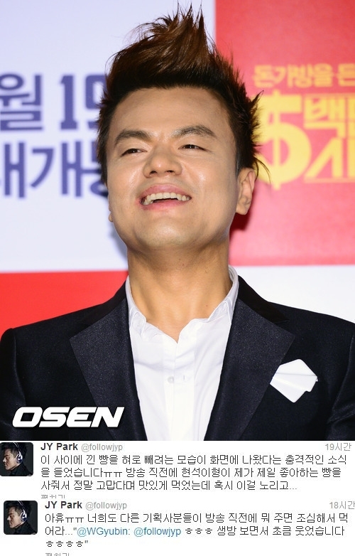 박진영은 지난 24일 오후 자신의 트위터에 “이 사이에 낀 빵을 혀로 빼려는 모습이 화면에 나왔다는 충격적인 소식을 들었습니다”라고 말문을 열었다.