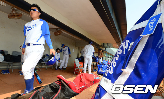 대표팀 선수들이 더그아웃에서 훈련 준비를 하고 있다.
