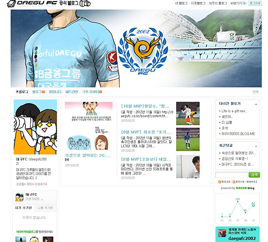 올 시즌 '행복나눔 2013! 희망돌풍 대구FC!'를 팀 모토로 정해 실천하고자 노력중인 대구FC가 공식 블로그를 오픈해 팬들에게 한발 더 다가간다.