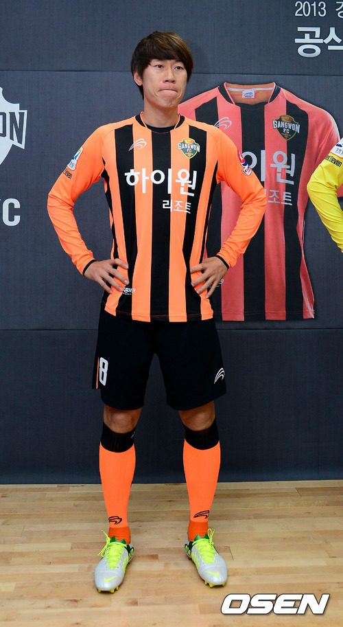 25일 오후 강원도 강릉시 노암동 오렌지하우스에서 진행된 '2013 강원FC 공식용품 후원 협약식 및 유니폼 발표회'에서 강원FC 김은중이 새로운 유니폼을 입고 포토타임을 갖고 있다.
