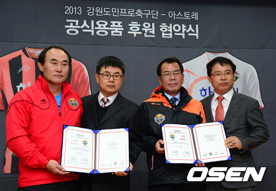 25일 오후 강원도 강릉시 노암동 오렌지하우스에서 진행된 '2013 강원FC 공식용품 후원 협약식 및 유니폼 발표회'에서 (왼쪽부터) 강원FC 김학범 감독, 김덕래 대표이사, 싸카스포츠 오정석 회장, 오근석 사장이 협약식을 마친 뒤 포토타임을 갖고 있다.