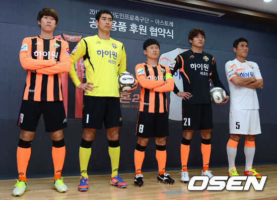 25일 오후 강원도 강릉시 노암동 오렌지하우스에서 진행된 '2013 강원FC 공식용품 후원 협약식 및 유니폼 발표회'에서 강원FC 김은중, 박호진, 전재호, 김근배, 배효성이 새로운 유니폼을 입고 포토타임을 갖고 있다.