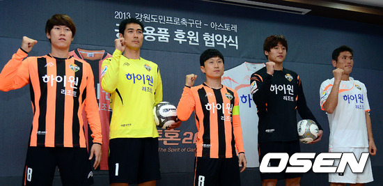 25일 오후 강원도 강릉시 노암동 오렌지하우스에서 진행된 '2013 강원FC 공식용품 후원 협약식 및 유니폼 발표회'에서 강원FC 김은중, 박호진, 전재호, 김근배, 배효성이 새로운 유니폼을 입고 포토타임을 갖고 있다.
