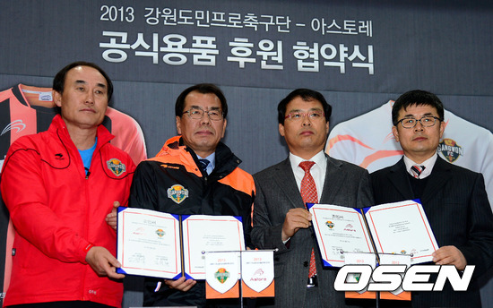 25일 오후 강원도 강릉시 노암동 오렌지하우스에서 진행된 '2013 강원FC 공식용품 후원 협약식 및 유니폼 발표회'에서 (왼쪽부터) 강원FC 김학범 감독, 김덕래 대표이사, 싸카스포츠 오정석 회장, 오근석 사장이 협약식을 마친 뒤 포토타임을 갖고 있다.