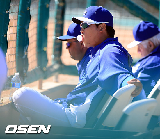 류현진이 의자에 앉은채 풍선껌을 불고 있다. 더그아웃에 마련된 의자는 보통 코칭스태프를 중심으로 사용되지만 비워진 자리는 선수들이 앉는다.